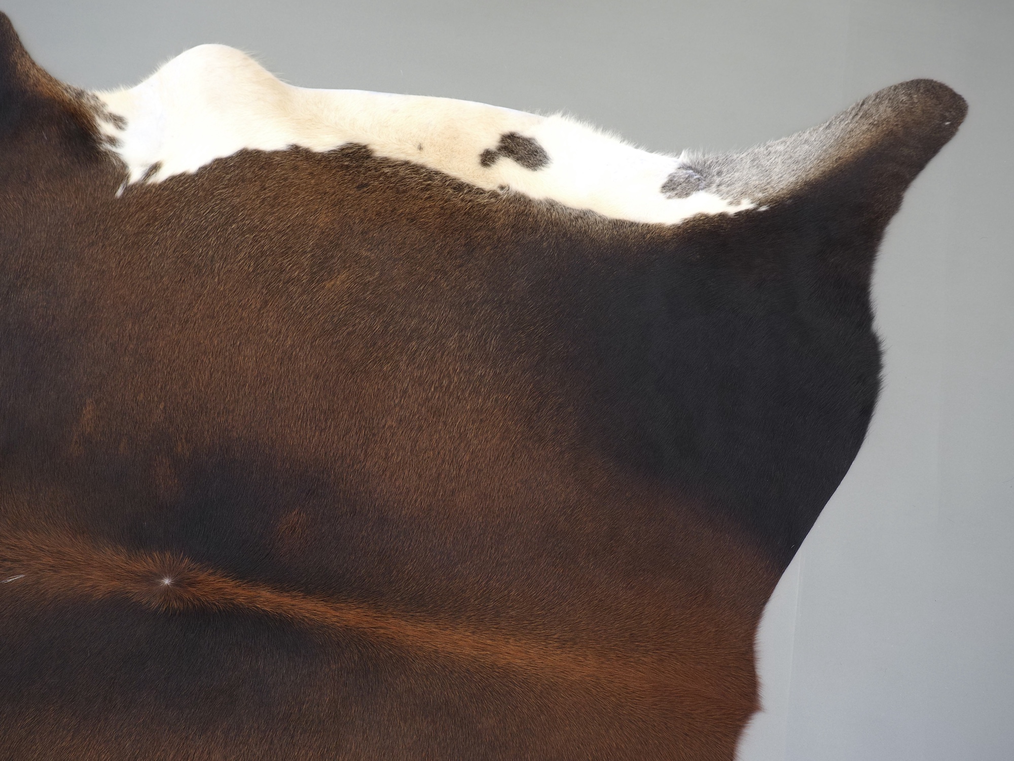 Шкура коровы плотно ложится на пол вне зависимости от покрытия и не скользит.