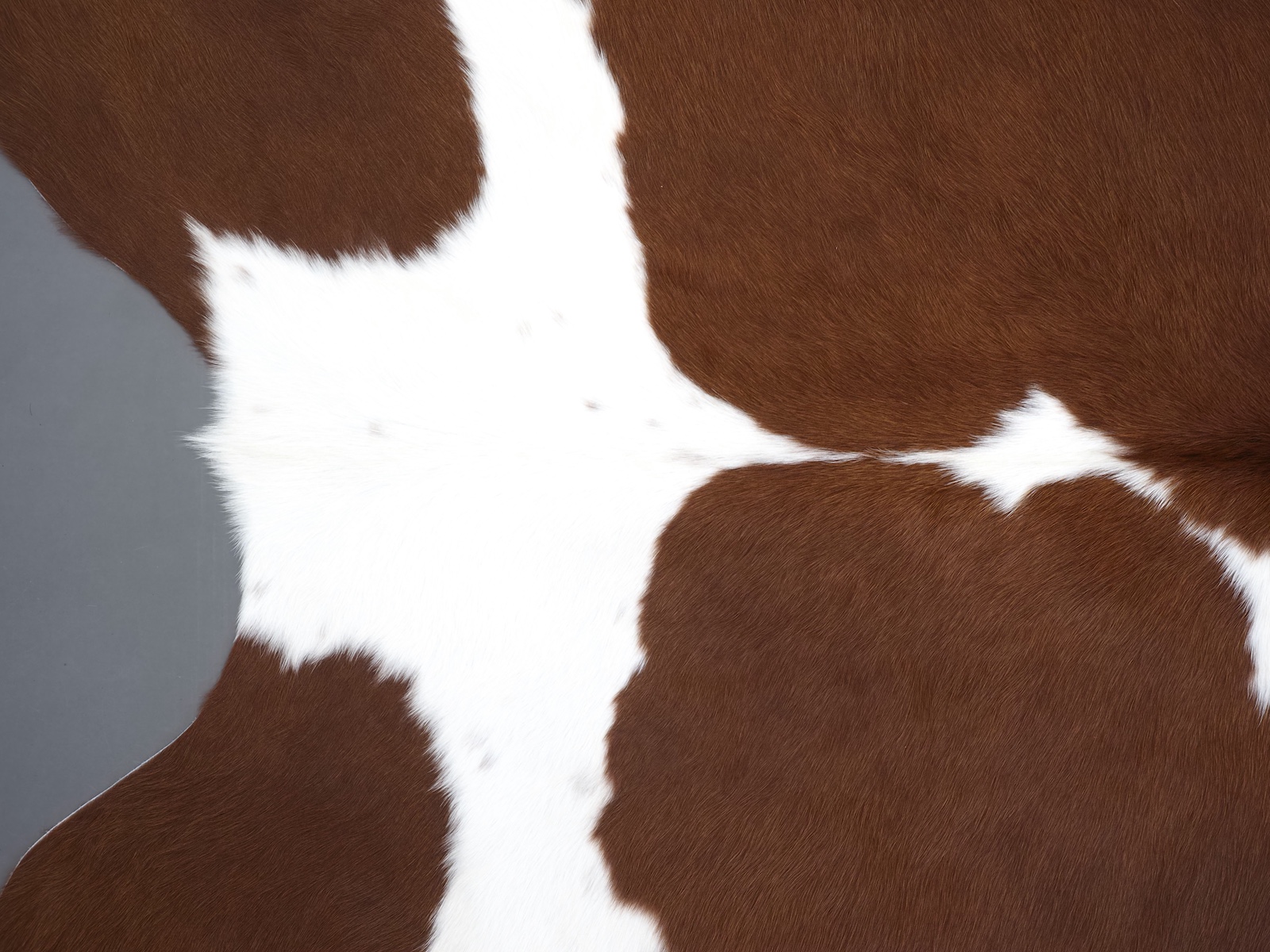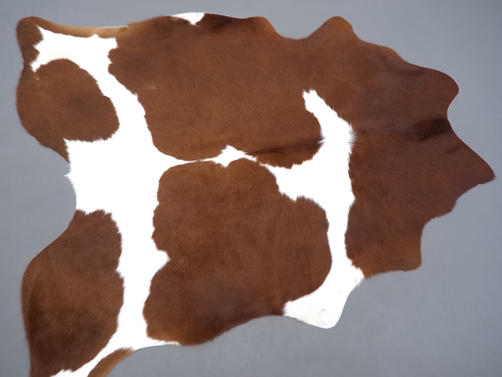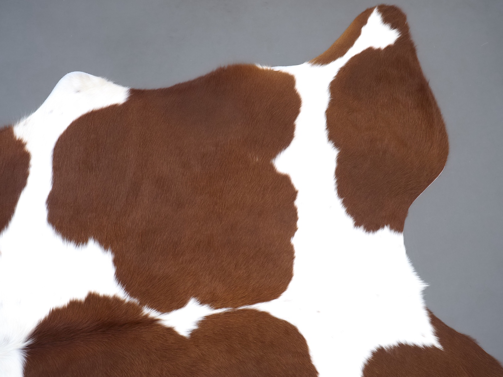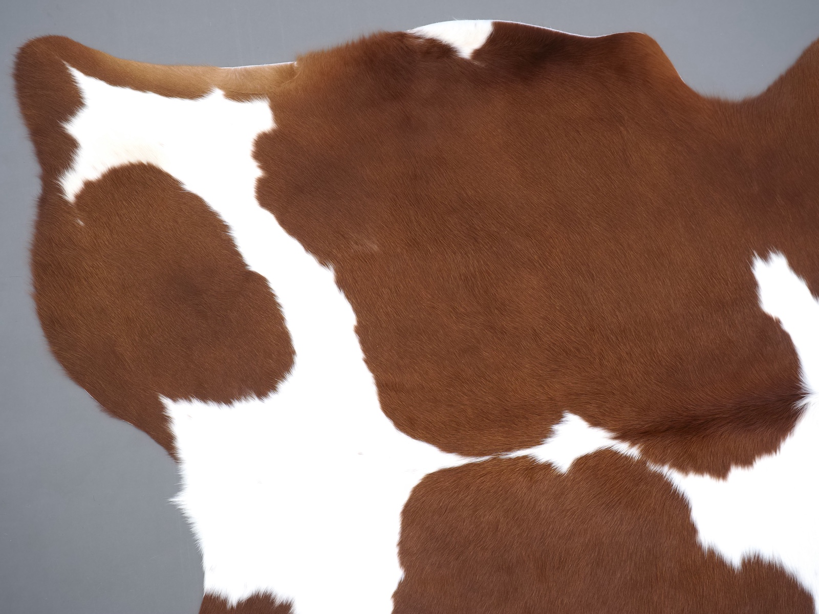 Натуральная шкура коровы коричнево-белая — порода характерезуется крупными пятнами на белом, блеск волосяного покрова.