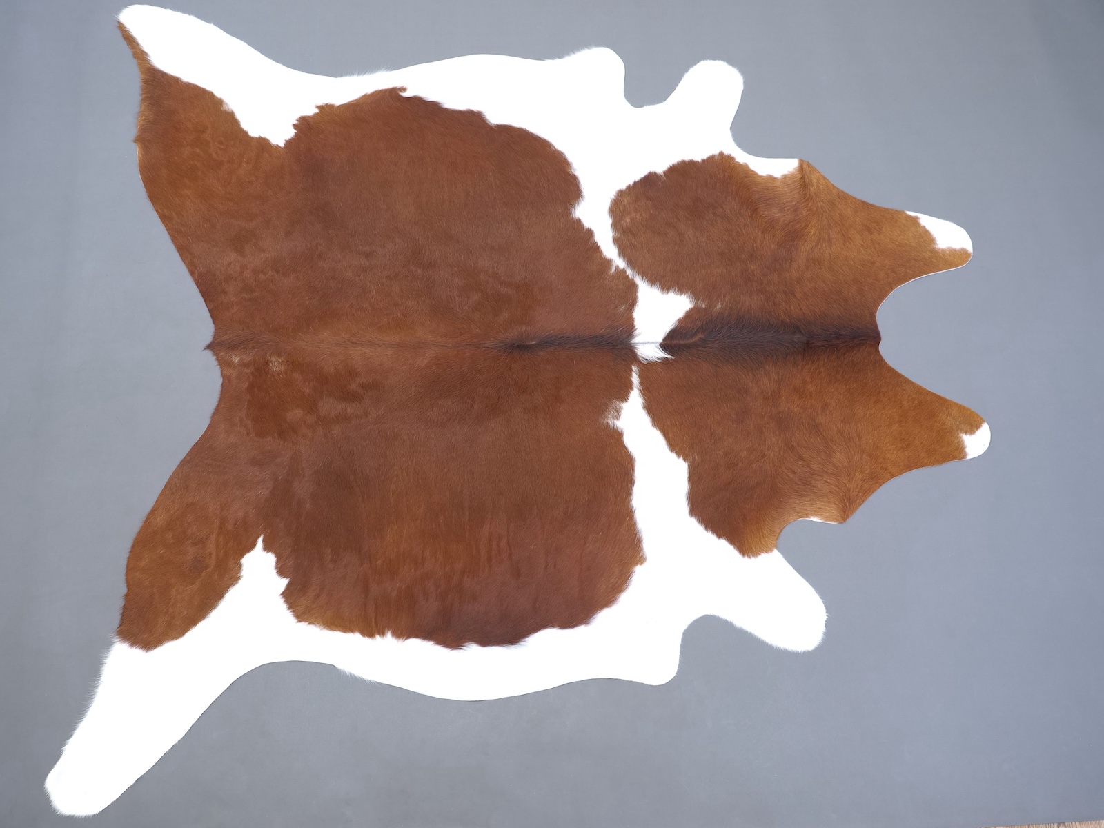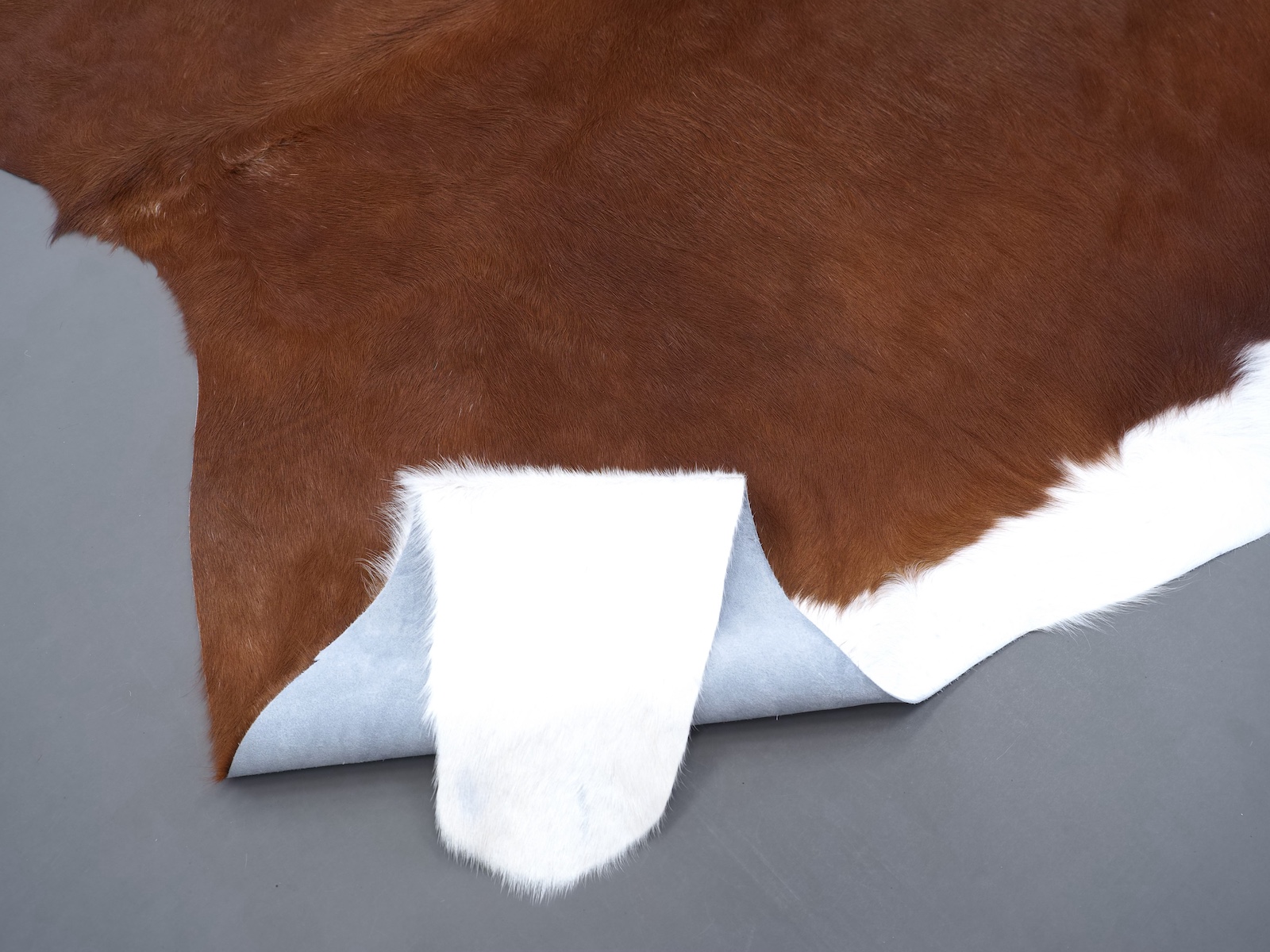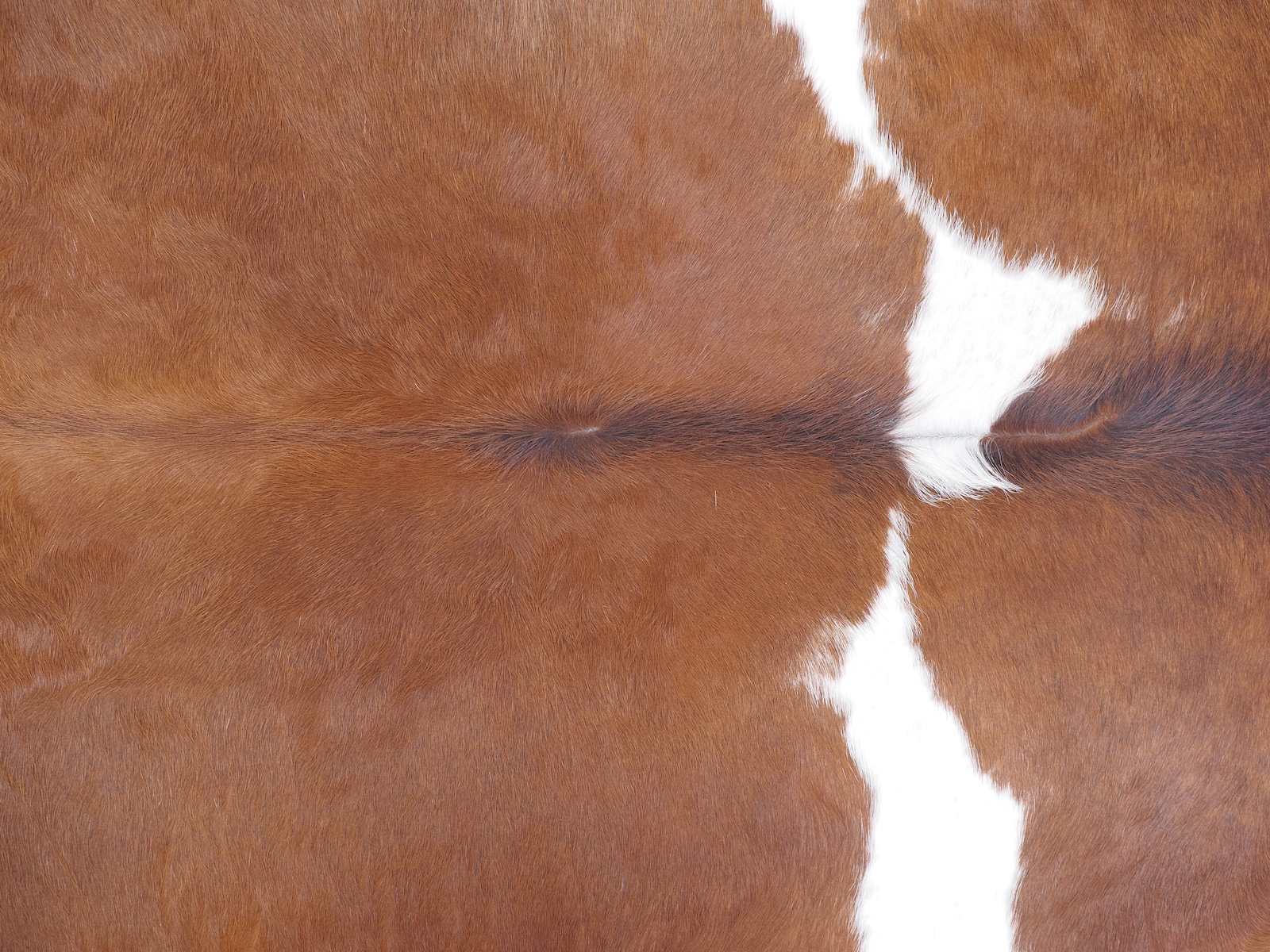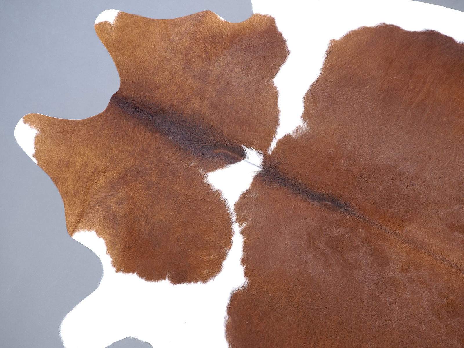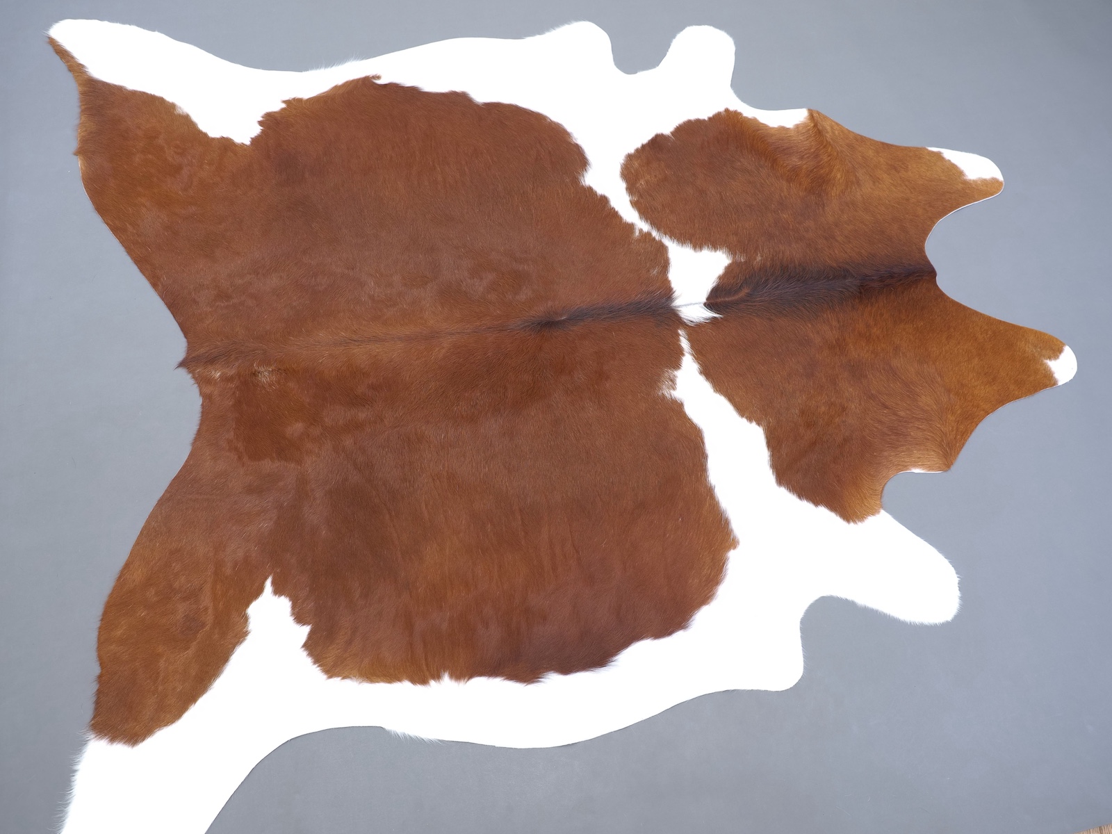Натуральная шкура коровы коричнево-белая — порода характерезуется крупными пятнами на белом, блеск волосяного покрова.