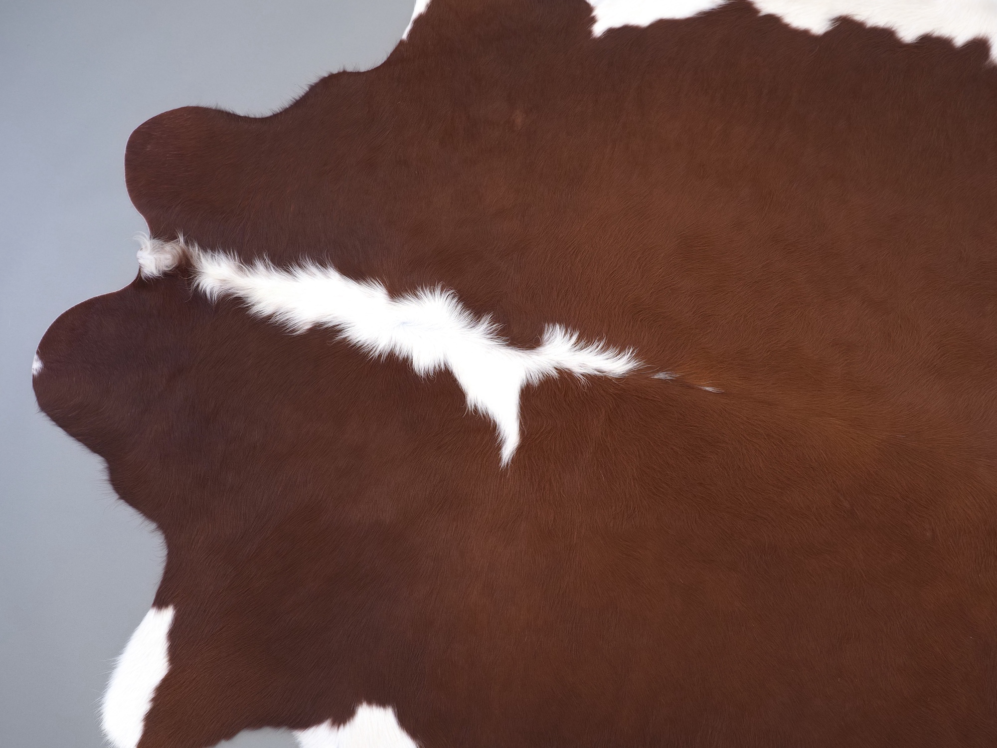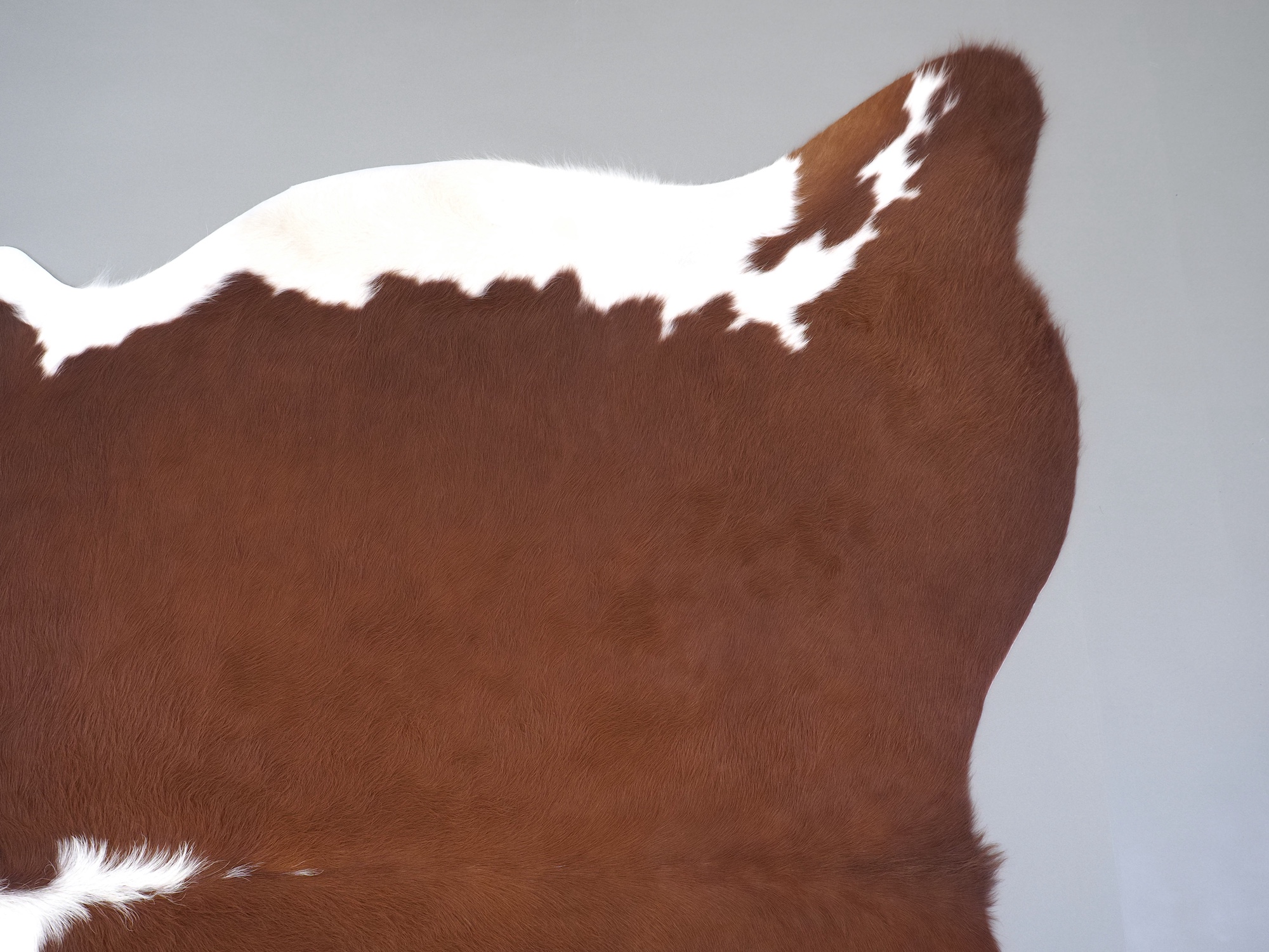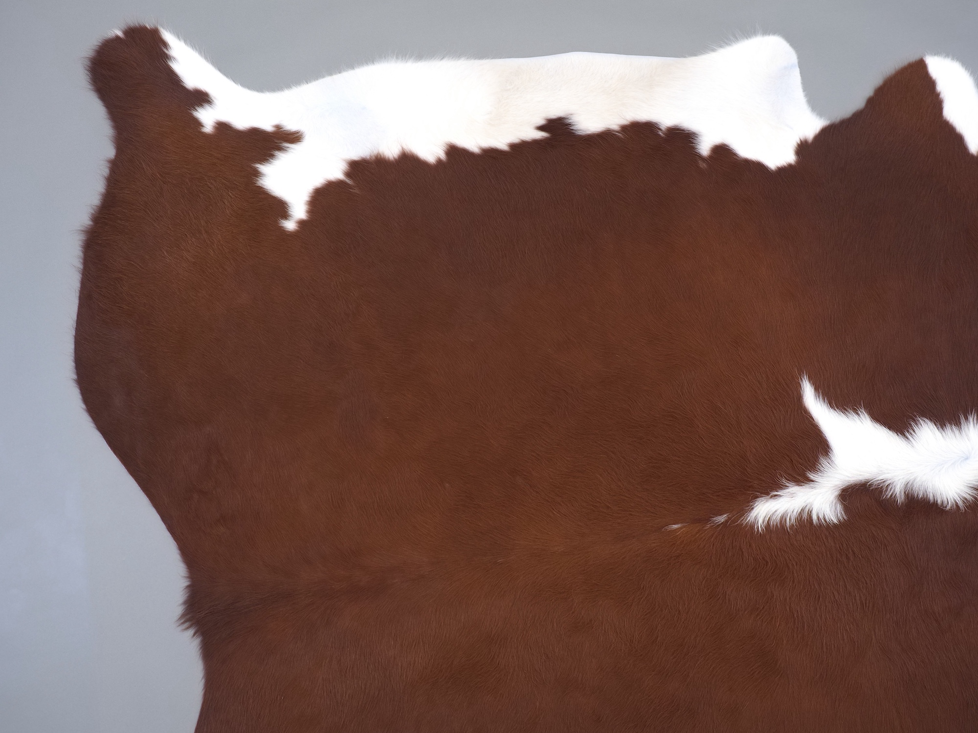 Натуральная шкура коровы коричнево-белая — порода характерезуется крупными пятнами на белом, блеск волосяного покрова.